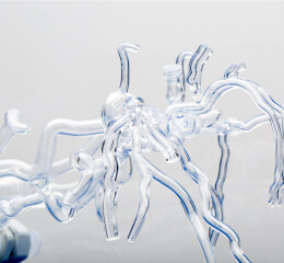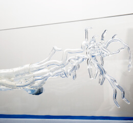 The NV Model accurately reproduces the shape of the aortic arch connecting the heart to the cerebral arteries using a 3D printer, allowing simulation training of endovascular treatment using catheters, such as coiling for cerebral aneurysm and thrombectomy for cerebral infarction, under X-ray fluoroscopy. Simulation training is available. It is possible to simulate the treatment process by inserting a catheter into a cerebral artery from a leg blood vessel and confirming the position of the device using a contrast medium, just like the actual clinical procedure.